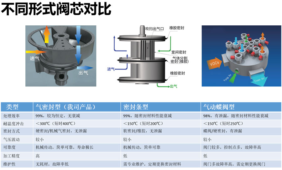 旋转阀结构简单、灵活,维护方便,加工精度高,采用机械硬密封和风刀密封,确保阀门密闭无泄漏;定子和转子之间采用气密封方式,以确保进气腔室与排气腔室之间不会窜气。